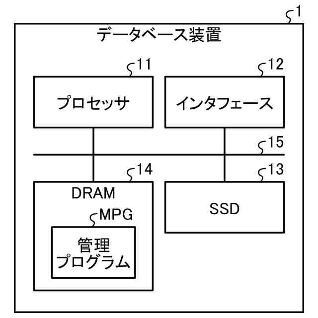 図1に示す例では、データベース装置1は、プロセッサ11、インタフェース12、SSD(Solid State Drive)13、DRAM(Dynamic Random Access Memory)14、およびバス15を備える。プロセッサ11、インタフェース12、SSD13、およびDRAM14は、バス15を介して相互に電気的に接続される。