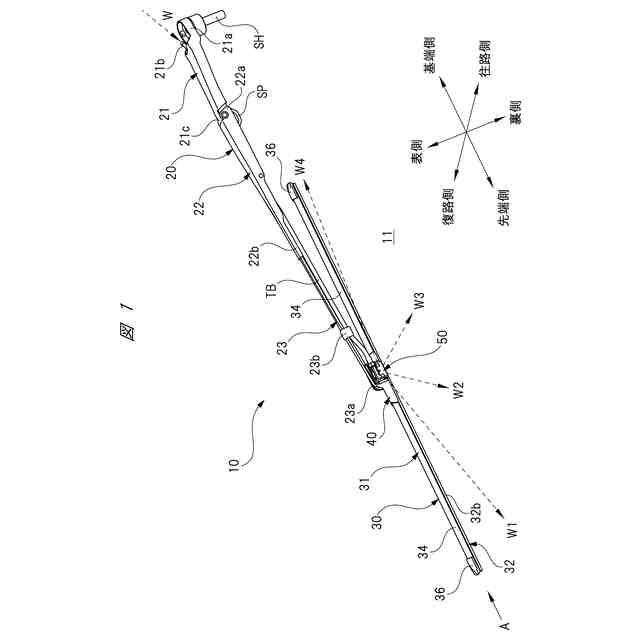 【解決手段】連結部材40の第2長辺壁部42に装着され、ウインドウガラスに向けてウォッシャ液を噴射するウォッシャユニット50を備え、ウォッシャユニット50は、カバー部材60と、第2長辺壁部42とカバー部材60との間に配置され、弾性変形可能なバルブ部材70と、カバー部材60とバルブ部材70との間に配置される流路と、カバー部材60に装着され、第2ウォッシャチューブからのウォッシャ液を流路に供給する配管接続部材80と、を有し、バルブ部材70は、流路の上流側に配置される開口部OPを備え、配管接続部材80は、ブレードラバーの長手方向に延び、第2ウォッシャチューブが接続されるチューブ接続部82と、チューブ接続部82の長手方向と交差する方向に延び、開口部OPに接続される差込部81eと、を有する。