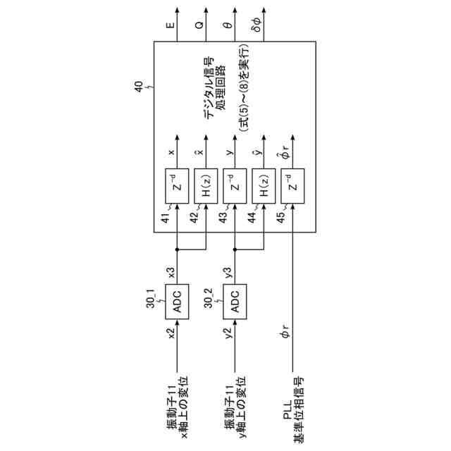 MEMS(Micro Electro Mechanical Systems:微小電気機械システム)で作成された角度直接検出型ジャイロセンサあるいはレート積分型ジャイロスコープ(Rate Integrating Gyroscope、以下RIG)などのジャイロセンサでは、振動子と同じ素子上の電極への印加電圧を制御することにより、振動子をx-y平面上で所望の振幅で一直線上に振動させ続け、疑似的にフーコーの振り子を実現している。この制御では、振動子のx-y平面上での軌跡(楕円軌道の長・短軸振幅、楕円軌道の傾き、振動子の楕円軌道上での位相)の情報を、検出されたx軸、y軸方向の振動子の位置信号から復調する必要がある。復調方法の1つとして、振動子の位相を検出する位相同期回路(Phase Locked Loop、以下、PLL)を用いた同期検波方式が良く用いられている。しかしながら、この手法では、PLLが収束するまで楕円軌道の長・短軸振幅や楕円軌道の傾きの復調が不正確になったり、PLLの制御ループと振動子の励振制御ループとが干渉を起こしたりする場合がある。