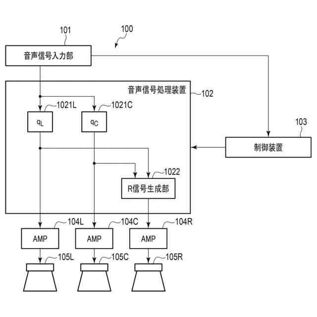 以下、図面を参照して実施形態を説明する。図1は、実施形態に係る音響制御装置の構成の一例を示す図である。図1の音響制御装置100は、音声信号入力部101と、音声信号処理装置102と、制御装置103と、アンプ104L、104C、104Rと、スピーカ105L、105C、105Rとを有している。