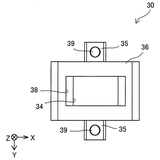 流路形成部材20は、流体を流通させるための流路が内部に形成された可撓性を有する部材である。本実施形態の流路形成部材20は、図2に示すように、外形が矩形の板状部材を3枚積層した3層構造を有している。すなわち、流路形成部材20は、第1シート22、第2シート24、第3シート26が、この順で積層されて形成されている。第1シート22および第3シート26は、同じ形状および同じ大きさの矩形の板状部材である。第2シート24は、図2(B)に示すように上面視でコの字形状(矩形の3つの辺に沿って形成される形状)に形成されており、第1シート22および第3シート26に挟まれることによって、流体が流れる流路25を形成する。流路25は、流路形成部材20の-X軸方向の端部側面で開口しており、開口部23を形成する。開口部23は、流路25内に流体を導く流入口として機能する。また、第1シート22は、流路25のX軸方向端部近傍において、Z軸方向に流路25と重なる位置に、第1シート22を厚さ方向に貫通する貫通孔21を備える。貫通孔21は、流路25を流れた流体を外部に導く排出口として機能する。図2(A)および図2(B)では、流路形成部材20の表面で露出しない第2シート24の外周部分や、第2シート24によって形成される流路25や、第1シート22に形成される貫通孔21を、破線によって示している。