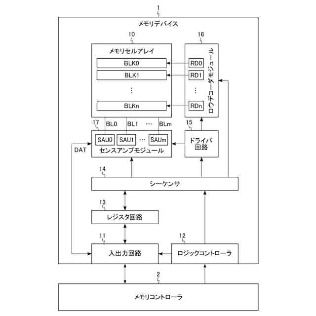 図1は、実施形態に係るメモリデバイス1を備えるメモリシステムの全体構成の一例を示すブロック図である。図1に示すように、メモリデバイス1は、外部のメモリコントローラ2によって制御される。メモリデバイス1は、例えば、データを不揮発に記憶することが可能なNAND型フラッシュメモリである。メモリデバイス1は、例えば、メモリセルアレイ10、入出力回路11、ロジックコントローラ12、レジスタ回路13、シーケンサ14、ドライバ回路15、ロウデコーダモジュール16、及びセンスアンプモジュール17を含む。