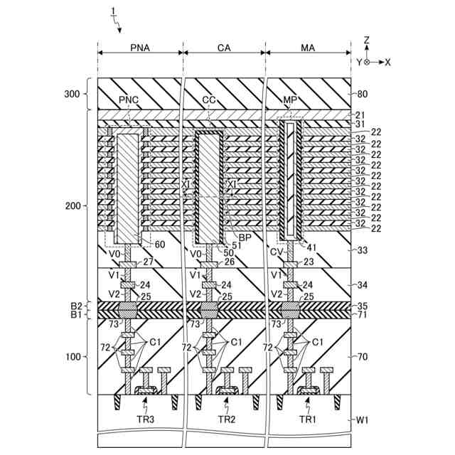 前記複数の第1コンタクトの各々は、前記第1方向に延伸して設けられ、且つ前記対応する導電体層を含む前記基板の表面と平行な断面において、外縁が前記対応する導電体層に囲まれつつ前記対応する導電体層と前記外縁の局所的な部分で電気的に接続された第1導電部材を有する、