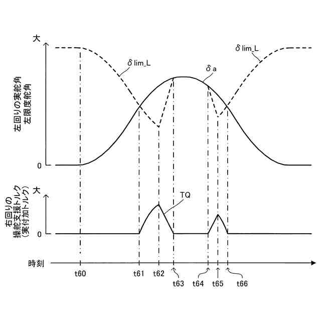 尚、本発明に係る車両運転支援装置において、前記制御装置は、前記走路境界を認識することができなくなった後、前記走路境界を認識することができるようになった時点で前記操舵支援制御により設定される前記操舵支援トルクがその時点における前記実付加トルクよりも大きい場合、急増抑制制御を実行してから前記操舵支援制御を実行するように構成され得る。そして、この場合において、前記急増抑制制御は、前記実付加トルクを単位時間当たり所定の急増抑制値ずつ大きくする制御、又は、前記走路境界を認識することができるようになった時点の前記実舵角から単位時間当たり所定の急増抑制角度ずつ小さくされる角度を前記限度舵角として用いて設定される前記操舵支援トルクを前記操舵操作に付加する制御である。
