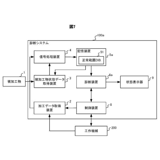 本開示の実施の形態に係る診断装置を、図1に示す診断システム100に適用した例を用いて説明する。診断システム100は、工作機械200により加工される対象物である被加工物の加工前の状態を示す被加工物状態データを取得し、工作機械200から加工中の動作状態を示す時系列データを収集する。被加工物状態データは、例えば、加工前の被加工物の温度、硬度、外観画像、表面性状、ロット番号、生産メーカなどの情報を含む。診断システム100は、収集した時系列データから特徴量を算出する。診断システム100は、算出した特徴量と取得した被加工物状態データとを機械学習モデルに適用して、工作機械200の異常の有無を判定する。