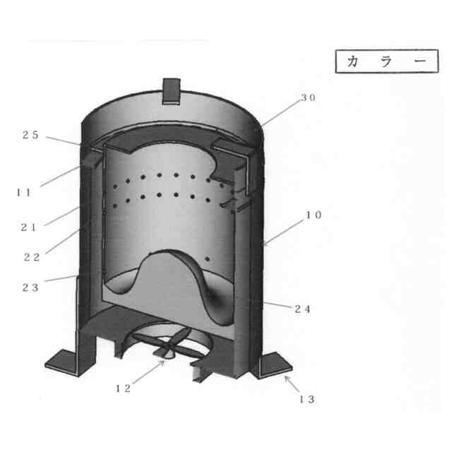 本発明者は種々の検討と実験を行った結果、連続した位置に設けた空気供給装置(図1二次燃焼空気吹出口22、三次燃焼用空気吹出口21)であっても二次燃焼と三次燃焼を発生させるための空気供給の方向を分けることで、個別の燃焼室や非連続な位置に設けた個別の空気供給装置を備えることなく、三次燃焼を発生させることができると想到し、従来の二次燃焼機能までを備えたウッドガスストーブの大きさのままで、かつシンプルな構造の三次燃焼機能を備えた本発明ウッドガスストーブを完成させた。