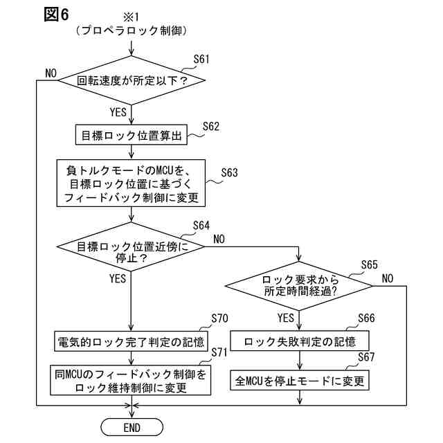 前記プロペラを回転不能な状態にロックさせるロック制御部(S63、S71、S80)を有し、