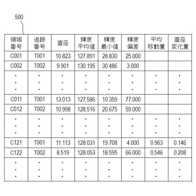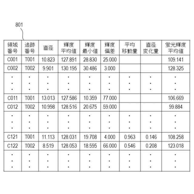 ラベリング処理後の各細胞候補領域の特徴量データ群の一例を示す。