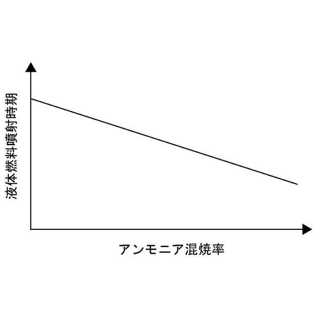 また、特許文献1によれば、供給タイミング制御手段は、液体燃料供給手段による液体燃料の供給を多段噴射する制御を行う。アンモニア混焼エンジンは、液体燃料の供給タイミングとしての進角をエンジンの上死点(TDC)に対して-25°から-70°の範囲で設定する。液体燃料とアンモニアの総供給量に対するアンモニアの供給量の比率が1%以上95%以下の範囲である。