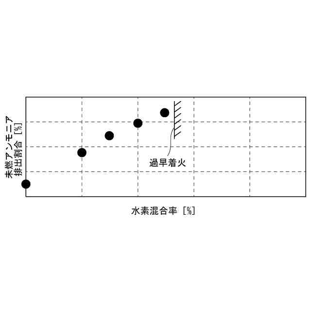 アンモニア混焼エンジンでは、アンモニアの供給量を増加して混焼率を0~95%へと増加していくに従って、燃焼安定性が低下し、排気ガス性状が悪化するおそれがあり、排気ガスに含まれるNH