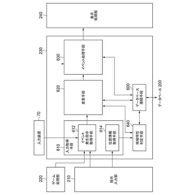 本実施形態に係るイベント処理部230の構成を指示入力部210、ゲーム処理部220、表示処理部240および入力装置70と共に示す。