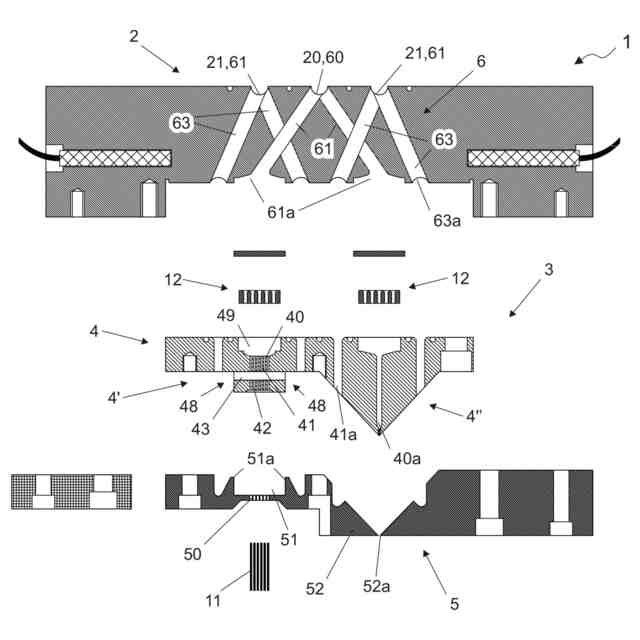 メルトブローン技術の分野において、特に、多列同軸メルトブローン型プラントが知られている。そのようなプラントの一例が図5a、図5b、図6、図7に示されている。