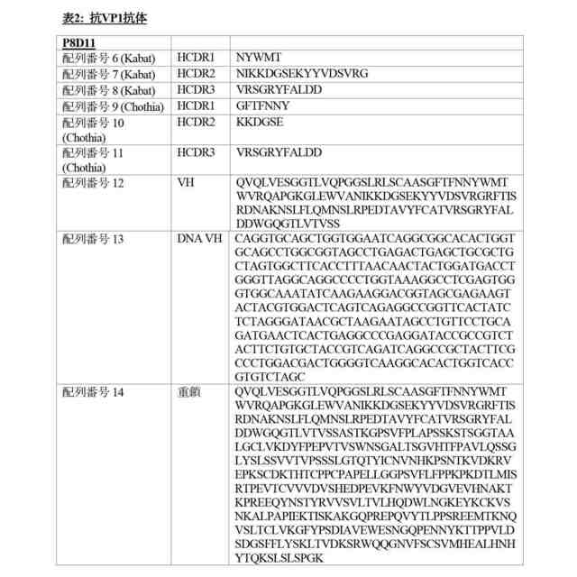 前記抗体または抗原結合性断片が、表1の少なくとも1つのVP1に特異的に結合する