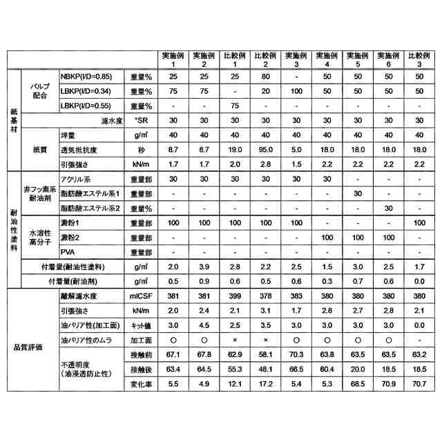 食品包装用の耐油紙には、油が紙を通過して反対面に漏れ出さない油バリア性を有すること、付着した油が耐油紙の表面に広がりにくく油が染み込んだ外観(染み込んだ部分が変色する)を呈さない油浸透防止性を有することなどの耐油性が要求される。さらに、食品包装用の耐油紙には、食品を包装した際に内容物が外から見え難いこと、有害物質を含まないこと、離解性(リサイクル性)があり資源として再利用できること等が要求される。