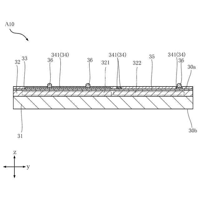 前記導電層は、前記回路に導通しない、かつ、前記厚さ方向に積層された少なくとも1つの第2層で構成されて前記厚さ方向に視て少なくとも1つの角部を含む形状を有する確認パターンを含み、