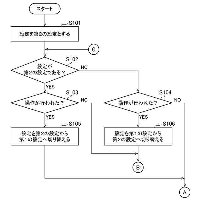 又は、前記制御部は、前記設定が前記第2の設定である間に前記操作部に前記操作が行われた場合は、前記設定を前記第2の設定から前記第1の設定へ切り替える