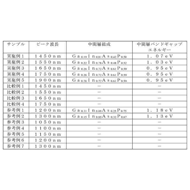 公開番号2025143693 公報種別公開特許公報(A) 公開日2025-10-02 出願番号2024043055 出願日2024-03-19 発明の名称赤外LED素子 出願人ウシオ電機株式会社 代理人弁理士法人ユニアス国際特許事務所 主分類H10H 20/824 20250101AFI20250925BHJP() 要約【課題】従来に比べてより低い駆動電圧により点灯させることができる赤外LED素子を提供する。 【解決手段】ピーク波長が1350nm~2000nmの赤外光を出射可能な赤外LED素子であって、第一導電型を示す第一半導体層と、厚みが15nm以上である中間層とを有する第一積層体と、第一積層体の中間層の上層に配置された活性層と、少なくとも前記第一導電型とは異なる第二導電型を示す第二半導体層を有する、活性層の上層に配置された第二積層体とを備え、活性層のバンドギャップエネルギーをEa、中間層のバンドギャップエネルギーをEm、第一半導体層のバンドギャップエネルギーをEpとしたときに、Ea<Em<Epである。 【選択図】 図1 特許請求の範囲【請求項1】 ピーク波長が1350nm~2000nmの赤外光を出射可能な赤外LED素子であって、 積層方向に、n型又はp型である第一導電型を示す第一半導体層と、厚みが15nm以上である中間層とを有する第一積層体と、 前記第一積層体の前記中間層の上層に配置された活性層と、 前記第一導電型とは異なる第二導電型を示す第二半導体層を有し、前記活性層の上層に配置された第二積層体とを備え、 前記活性層のバンドギャップエネルギーをE a 、前記中間層のバンドギャップエネルギーをE m 、前記第一半導体層のバンドギャップエネルギーをE p としたときに、E a <E m <E p であることを特徴とする赤外LED素子。 続きを表示(約 710 文字)【請求項2】 前記活性層は、井戸層、及び障壁層が積層されてなり、前記障壁層のバンドギャップエネルギーをE b としたときに、E a <E b <E m であることを特徴とする請求項1に記載の赤外LED素子。 【請求項3】 前記中間層は、ドーパント濃度が2×10 18 /cm 3 以下の半導体層であることを特徴とする請求項1又は2に記載の赤外LED素子。 【請求項4】 前記活性層は、厚みが30nm以上であることを特徴とする請求項1又は2に記載の赤外LED素子。 【請求項5】 前記第一半導体層がInPからなることを特徴とする請求項1又は2に記載の赤外LED素子。 【請求項6】 前記活性層がGaInAsPからなることを特徴とする請求項1又は2に記載の赤外LED素子。 【請求項7】 前記第一積層体は、前記第一半導体層の上層に配置されたAlInAsからなる電子ブロック層を有することを特徴とする請求項1又は2に記載の赤外LED素子。 【請求項8】 前記活性層のバンドギャップエネルギーをE a と、前記第一半導体層のバンドギャップエネルギーをE p との差を100%としたときに、前記活性層のバンドギャップエネルギーをE a と、前記中間層のバンドギャップエネルギーE m との差が30%~60%の範囲内であることを特徴とする請求項1又は2に記載の赤外LED素子。