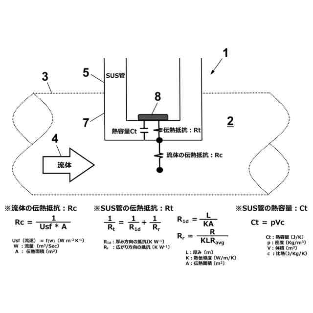 また、本発明は、前記構成からなる熱式流量計において、前記センサ部は、前記流路に設置される伝熱管と、前記伝熱管内に配置されて前記接流体部の加熱及び温度検出を行う測温抵抗体と、前記測温抵抗体の抵抗値に比例したパルス電流を印加するトランスと、前記トランスに流れるパルス電流により前記測温抵抗体の抵抗値に比例したパルス電圧を発生させる基準抵抗と、を備えて構成されていることを特徴とする。