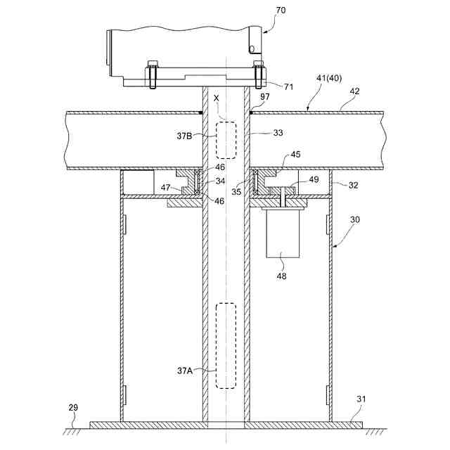 前記旋回体の内部において、前記伸縮機構が設けられる領域よりも前記中間側に第1隔壁が設けられ、前記第1隔壁から前記中間に至る領域が前記気体で満たされた密閉空間とされる、