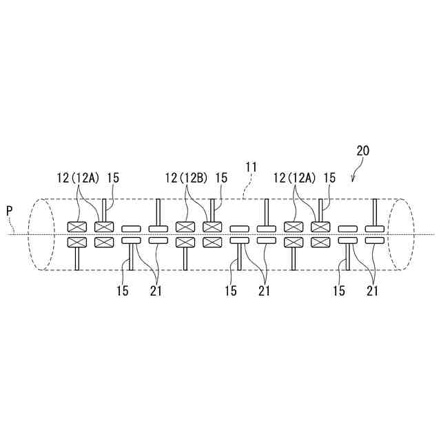 図9は、従来の収束要素内蔵型ドリフトチューブ加速器を示す概略縦断面図である。図10には、図9の収束要素内蔵型ドリフトチューブ加速器におけるドリフトチューブの配列構成が示されている。この図10に示すように、従来の収束要素内蔵型ドリフトチューブ加速器100では、加速空洞101内に、粒子のビームを水平方向に収束させる収束要素内蔵ドリフトチューブ102、収束要素が内蔵されていない収束要素非内蔵ドリフトチューブ103、粒子のビームを鉛直方向に収束させる収束要素内蔵ドリフトチューブ104、収束要素非内蔵ドリフトチューブ103が、ビーム軸Oに沿って順次配置(配列)されて1周期を構成し、これらのドリフトチューブ102、103、104、103が周期的に配置されている。
