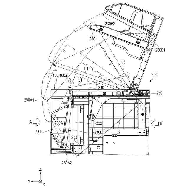 【解決手段】第2隔壁220に固定され、吸引部と連通する外側ダクト231と、筐体100に固定され、外側ダクト231と連通可能な内側ダクト232と、を備え、内側ダクト232は、正面側Aを向いて開口し、外側ダクト231と接続される内側接続開口部230Aを有し、外側ダクト231は、開閉カバー200の開閉に伴い、内側接続開口部230Aと接離可能に構成される外側接続開口部230Bを有し、内側接続開口部230Aは、天面100aに近い第1端部230A1の方が、天面100aから離れた第2端部230A2よりも、回動軸250に近い。