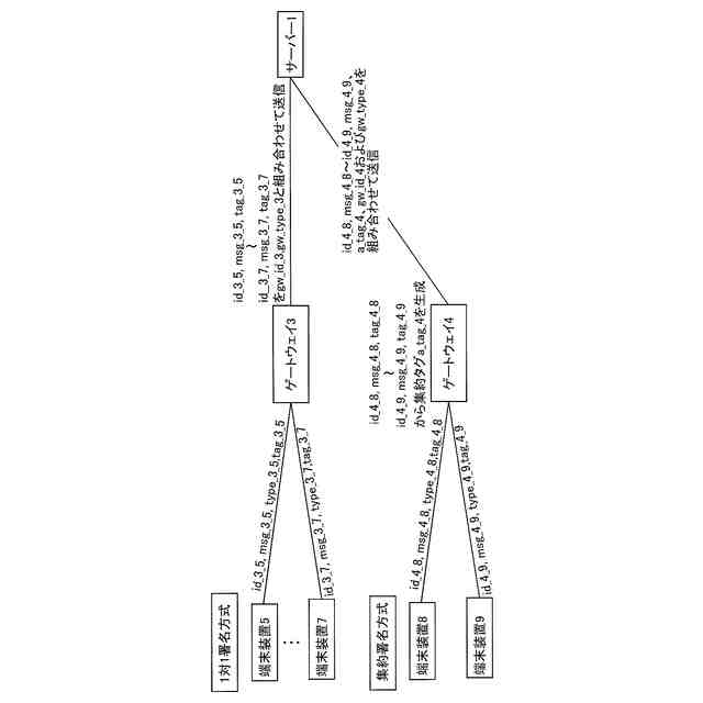 【解決手段】端末装置5~7の各々は、署名方式が1対1署名方式であるとき、自己が検出したデータmsgと自己の識別情報idと署名方式typeと、データmsgおよび識別情報idに1対1署名用鍵を用いて署名して生成したタグtagとをゲートウェイ3へ送信し、ゲートウェイ3は、端末装置5~7の各々から受信した[msg,id,type,tag]をサーバー1へ送信する。端末装置5~7の各々は、署名方式が集約署名方式であるとき、[msg,id,type,tag’(=集約署名用鍵を用いて署名して生成したタグ)]をゲートウェイ3へ送信し、ゲートウェイ3は、msg,id,tag’に集約署名用鍵を用いて署名して生成した集約タグa_tagと[msg,id]とをサーバー1へ送信する。