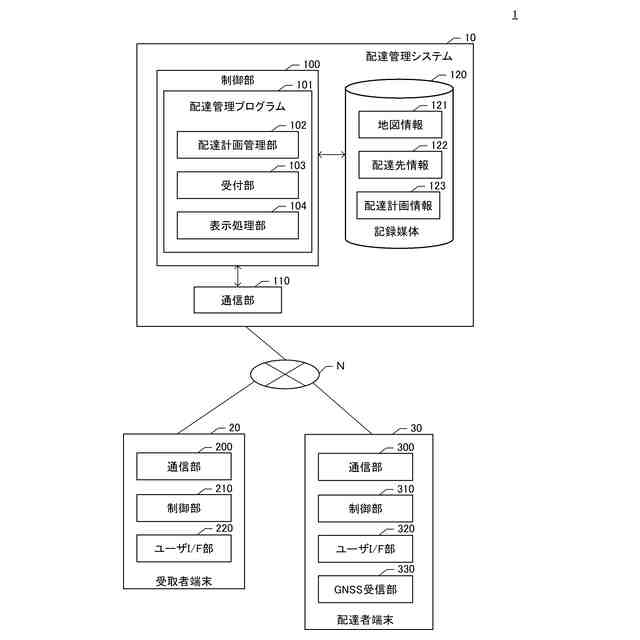 図1は、実施形態に係る配達システム1の全体構成を示す図である。配達システム1は、複数の配達車両それぞれによる、配達物の再配達を管理するシステムである。配達システム1は、複数の配達車両それぞれによる配達や再配達を管理する配達管理システム10と、配達物の受取者が所持する受取者端末20と、配達車両を運転する配達者が所持する配達者端末30と、を備えている。なお、図1においては、受取者端末20及び配達者端末30を1つのみ示しているが、実際には、配達システム1は、複数の受取者端末20と、複数の配達者端末30と、を備える。配達管理システム10、受取者端末20及び配達者端末30は、ネットワークNを介して通信可能に接続されている。本実施形態においては、配達物の受取者が、配達物の再配達を指定する場合の処理について説明する。