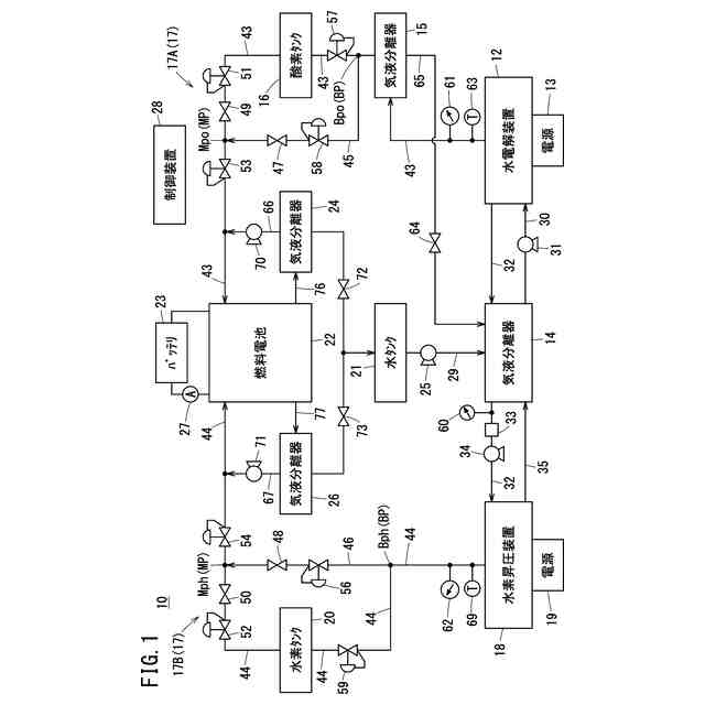 【解決手段】水素昇圧装置と水電解装置の脱圧処理を実行する際に、開閉弁(47、48、49、50)を開いた状態にし、且つ供給用減圧弁(51、52)の設定圧力をバイパス用減圧弁(56、58)の設定圧力よりも低い値に調整する。これにより、ガス脱圧領域(81、82)に残存するガスを、バイパス用減圧弁(56、58)を介して燃料電池(22)に供給し得る。