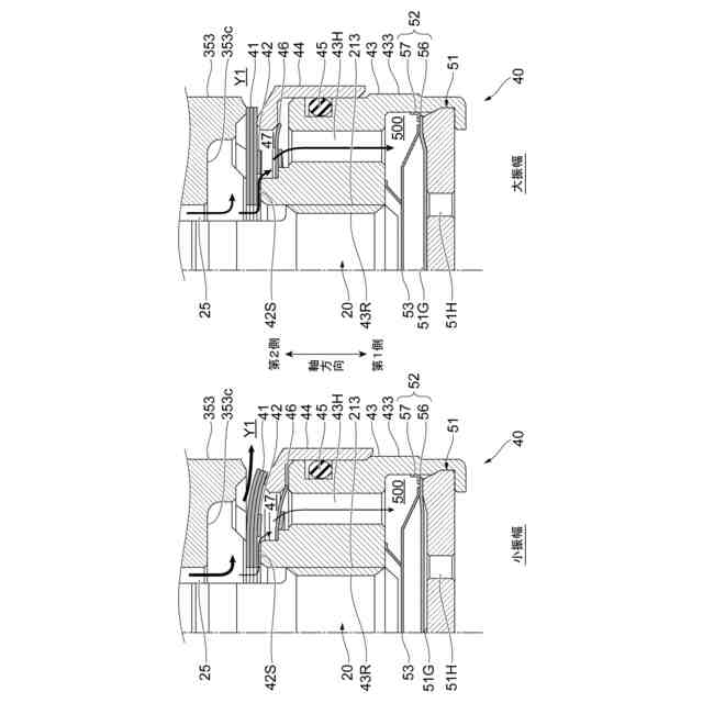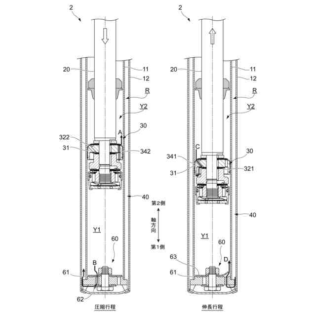 以下では、ロッド20の軸方向を、単に「軸方向」と称する場合がある。また、軸方向の第1側(図1では下側)、軸方向の第2側(図1では上側)を、それぞれ、単に「第1側」、「第2側」と称する場合がある。また、軸方向に交差する方向(例えば、直交方向)を、「半径方向」と称する場合がある。半径方向において、シリンダ11の中心線側を単に「内側」と称し、中心線から離れる側を単に「外側」と称する場合がある。