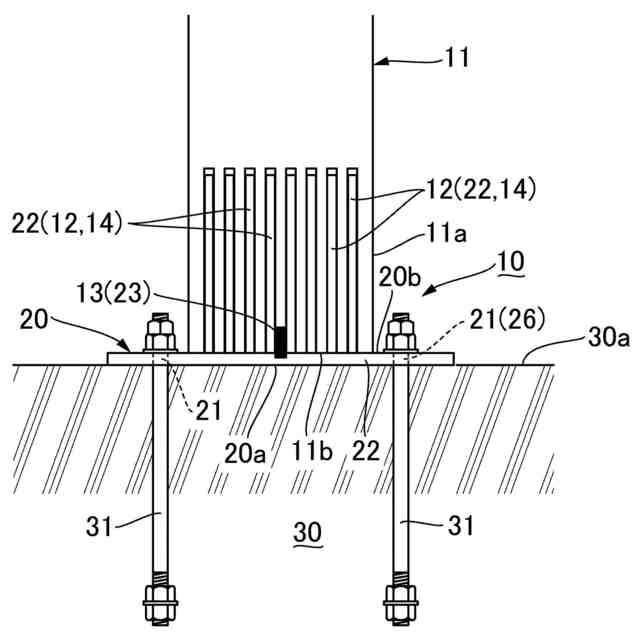 一方、GIR工法を用いて木質部材である例えば木製柱をコンクリート面に立設させた状態で接合する場合、上述の従来のプレキャストコンクリート製の柱の接合部の構造と同様に、例えば金属製のベースプレートを介して複数の中空鋼棒を、鉄筋コンクリート製のスラブ等によるコンクリート面から突出させておき、立設させる木製柱を、これの下端面に穿孔形成された複数の鋼棒固着孔に、突出させた中空鋼棒を各々差し込んだ状態で、コンクリート面に建て込んだ後に、中空鋼棒が差し込まれた各々の鋼棒固着孔に、当該中空鋼棒を介して充填固化剤を注入して固化させることによって、木製柱をコンクリート面に立設させた状態で接合することが考えられる。