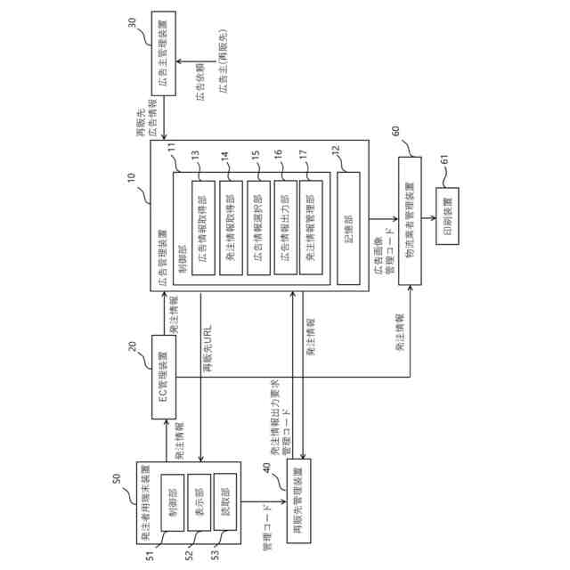 【解決手段】再販先サイトへのアクセス情報を含む再販先の広告情報であって、商品の梱包材に印刷される広告情報を複数記憶する記憶部12と、商品の発注情報の取得に応じて、複数の広告情報の中からいずれかの広告情報を選択する広告情報選択部15と、商品の発注情報と選択された広告情報とを対応づけて管理する発注情報管理部17とを備え、発注情報管理部17が、商品の梱包材に印刷された広告情報の読取りに応じて、再販先サイトに対して広告情報に対応する商品の発注情報を出力する。