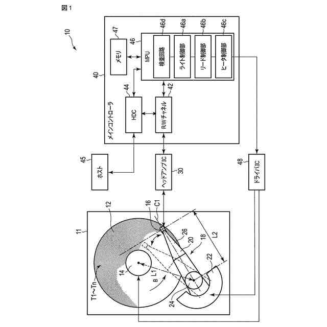 メインコントローラ40およびドライバIC48は、例えば、筐体11の背面側に設けられた図示しない制御回路基板に構成されている。メインコントローラ40は、R/Wチャネル42、ハードディスクコントローラ(HDC)44、マイクロプロセッサ(MPU)46、メモリ47、等を備えている。メインコントローラ40は、ヘッドアンプIC30を介して磁気ヘッド16に電気的に接続されている。メインコントローラ40は、ドライバIC48を介して、VCM22及びスピンドルモータ14に電気的に接続されている。HDC44は、ホストコンピュータ45に接続可能である。