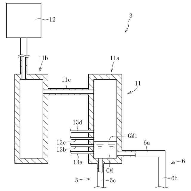 前記減圧脱泡槽に接続されるクッション槽と、前記クッション槽に接続されるとともに前記減圧脱泡槽を減圧する減圧装置と、を備える、