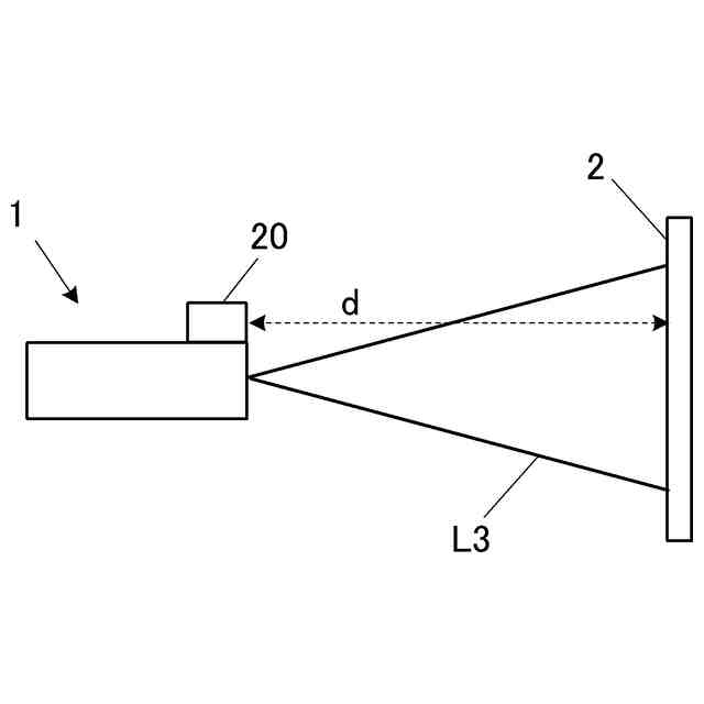以下、本発明の実施の形態を図面に基づいて説明する。図1に示すように、本実施形態の投影装置1は、投影対象2に対して画像光L3を投影することで、投影対象2の表面に種々の画像を表示(投影)する。投影対象2は、例えばスクリーンであってもよいし、建物の壁、床若しくは天井等、又は任意の物体の表面等であってもよい。本実施形態において、投影装置1から投影対象2までの距離dは約2mであるが、これに限られない。投影対象2の表面に投影される画像は、特には限られないが、例えば、周囲にいる人を案内するための案内標識の画像であってもよいし、投影対象2の表面を装飾するための画像であってもよい。