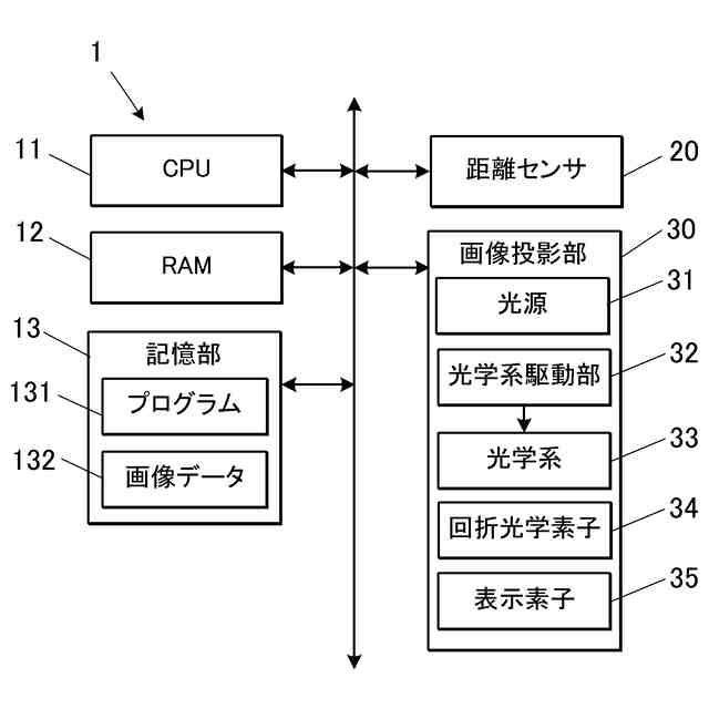 図2に示すように、投影装置1は、CPU11(Central Processing Unit)(制御部、制御手段)と、RAM12(Random Access Memory)と、記憶部13と、距離センサ20と、画像投影部30と、を備える。投影装置1の各部は、バス等のデータ伝送経路を介して接続されている。投影装置1は、図2に示されていない構成、例えば、ユーザの入力操作を受け付ける操作部、投影装置1のステータス情報等を表示する表示部、及び外部機器との間で通信を行う通信部等をさらに備えていてもよい。
