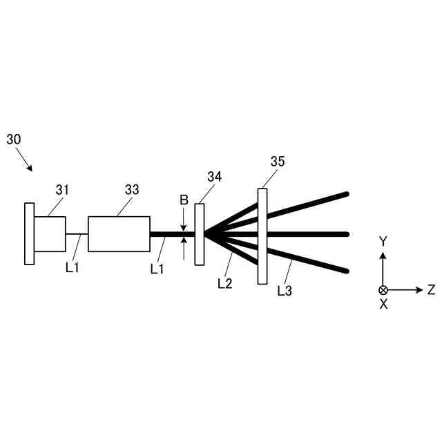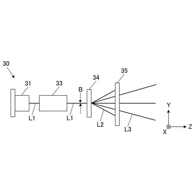 【解決手段】レーザ光を射出する光源と、光源から入射したレーザ光を、当該レーザ光のビーム径に応じた直径を有する複数のドットを投影対象に形成可能なドットパターン光に変換する回折光学素子と、光源と回折光学素子との間におけるレーザ光の光路に配置され、回折光学素子に入射するレーザ光のビーム径を変更可能な光学系と、を備える。