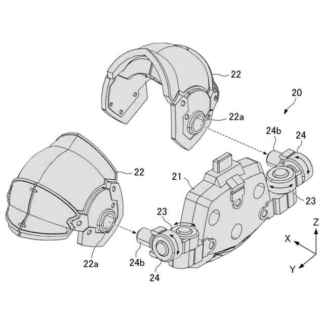 本発明に係る一実施形態の模型玩具100の構成例について説明する。図1は、一実施形態の模型玩具100の模式図である。本明細書では、説明を分かりやすくするため、人形体10の前後方向をX方向とし、人形体10の左右方向をY方向とし、人形体10の上下方向をZ方向とするXYZ座標系で模型玩具100の方向を示す。+X方向は人形体10の前面側を示しており、-X方向は人形体10の背面側を示している。+Y方向は人形体10の左側を示しており、-Y方向は人形体10の右側を示している。+Z方向は人形体10の上側を示しており、-Z方向は人形体10の下側を示している。