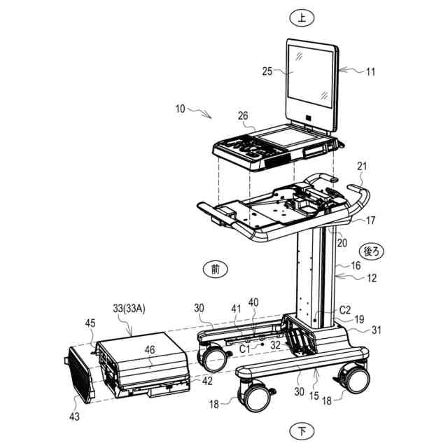 特許文献1および特許文献2には、脚車部の前後左右方向のほぼ中心に支柱の下端が取り付けられた医療機器用カートが記載されている。特許文献1に記載の医療機器用カートは、医療機器としての超音波診断装置の本体部にバッテリーが取り付けられている。そして、本体部は支柱の後方側であって、脚車部の台座上に配置されている。