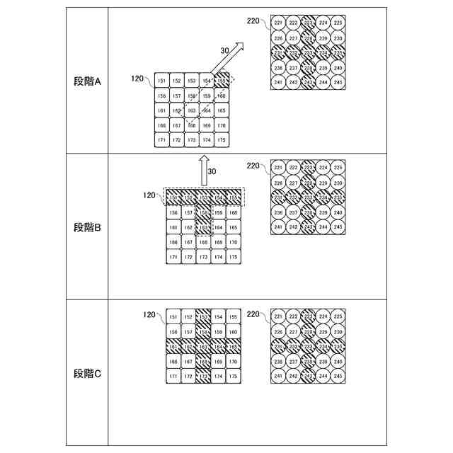 前記システムにおいて、前記複数の第2レーザ照射部は、マトリクス状に配置されていてよく、前記第2制御部は、前記第2レーザユニットに予め定められた第1の2次元のパターンでレーザ光を照射させるように、前記複数の第2レーザ照射部を制御してよく、前記第1制御部は、前記第1の2次元のパターンと、前記複数の第1レーザ受光部によって受光した受光パターンとに基づいて、前記第1レーザユニットの位置を基準とした前記第2レーザユニットの相対方向を推定してよい。前記予め定められた2次元のパターンは、十字型であってよい。