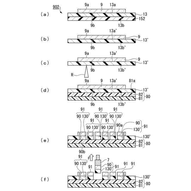 このような場合、例えば、ウエハの裏面など、ワークの目的とする箇所に、保護膜を形成するための保護膜形成フィルムを貼付し、以降、ワークを加工してワーク加工物を作製し、必要に応じて保護膜形成フィルムを硬化させ、保護膜形成フィルム又は保護膜を切断して、ワーク加工物と、そのいずれかの箇所に設けられた保護膜と、を備えた保護膜付きワーク加工物を製造する。保護膜付きワーク加工物の一例としては、半導体チップと、その裏面に設けられた保護膜と、を備えた保護膜付き半導体チップが挙げられる。