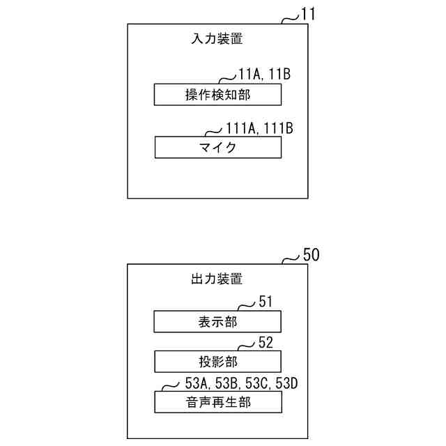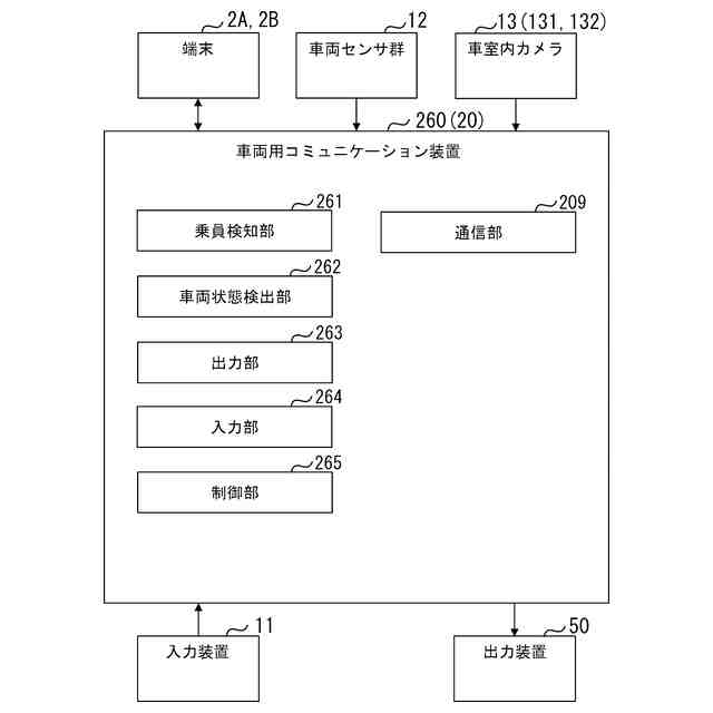 図1は、車両用コミュニケーション装置を含むIVIシステムの一例を示す模式図である。IVIシステムは、制御装置20と、移動体としての車両100の車両センサ群12と、車両100に設けられた出力装置50を構成する表示部51、投影部52および音声再生部53A~53Dと、車両100に設けられた入力装置11を構成する操作検知部11A,11B、およびマイク111A,111Bと、車両100に設けられた車室内カメラ13を構成する前席カメラ131および後席カメラ132と、車室の前席の乗員P1が使用する端末2Aと、車室の後席の乗員P2が使用する端末2Bとを含む。