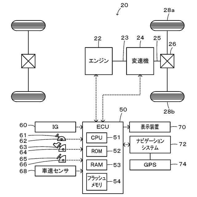 本開示の実施形態としての自動車20の構成の概略を示す構成図である。