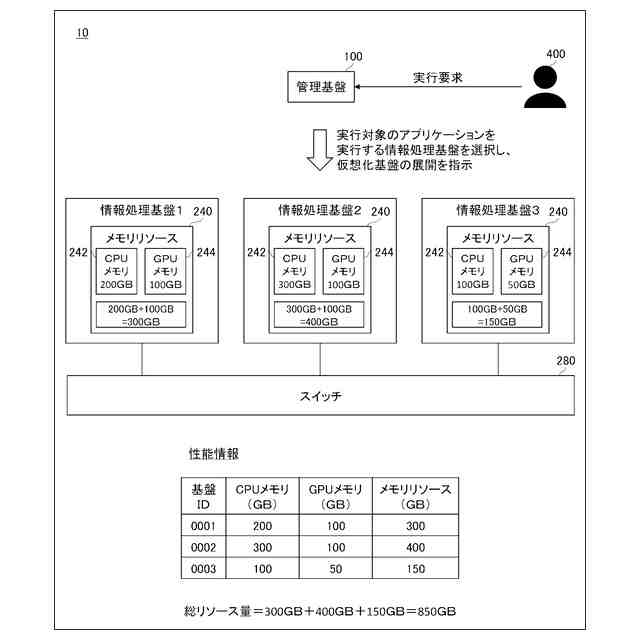 【解決手段】システム10において、メモリリソースを有する複数の情報処理基盤を管理する管理基盤は、各情報処理基盤のメモリリソースの空きリソース量を示す空きメモリリソース量情報と、複数の情報処理基盤の各情報処理基盤上で実行中のアプリケーションの数を示すアプリケーション数情報とを取得し、アプリケーションの実行要求を受け付け、実行要求に含まれ、実行対象のアプリケーションを実行するために割り当てられる必要があるメモリリソースの割当リソース量を示す割当リソース量情報と、空きメモリリソース量情報と、アプリケーション数情報とに基づいて、実行対象のアプリケーションを実行する情報処理基盤として、複数の情報処理基盤の中から、実行中のアプリケーションの数が最も少ない情報処理基盤を選択する。
