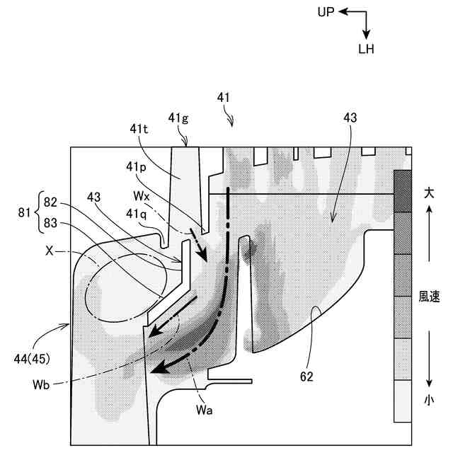 前記第1壁部(82)は、前記筒状部(41t)の内周部分を構成すると共に前記遠心ファン(43)に向けて突出する内周側突出リブ(41p)と、前記筒状部(41t)の外周部分を構成すると共に前記遠心ファン(43)に向けて突出する外周側突出リブ(41q)の間の開口に向けて指向する