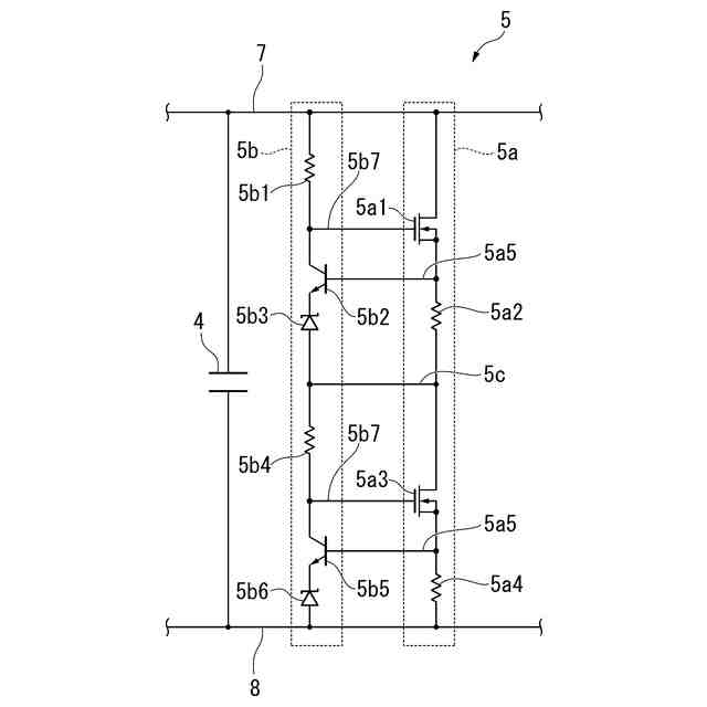 【解決手段】平滑コンデンサ4に並列に接続され、平滑コンデンサ4に蓄積された電荷を放電電流として放電させる放電装置5であって、放電電流が流れる放電部5aと、放電部5aに流れる放電電流の大きさを調整する放電電流調整部5bとを備え、放電部5aと放電電流調整部5bとが平滑コンデンサ4に対して並列に接続され、放電電流調整部5bは、第2放電電流調整部用半導体スイッチ5b5と、第2放電電流調整部用半導体スイッチ5b5よりも低電位側に位置すると共に第2放電電流調整部用半導体スイッチ5b5と直列に接続された第2ツェナーダイオード5b6とを有する。
