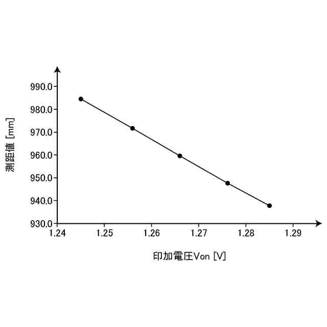図3は、特定の距離をターゲットにして測距した場合に、受光部が受光中における印加電圧と測距値の関係を示す図である。