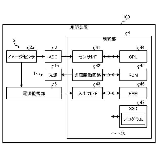 図1は、第1の実施の形態にかかる投受光装置を備えた測距装置100のハードウェア構成を示すブロック図である。撮像装置としても機能する測距装置100は、測距装置100から対象物までの測距を行う。測距装置100は、光を照射してから反射光を受光するまでの時間に基づき対象物までの距離を算出するToF(Time of Flight)カメラである。