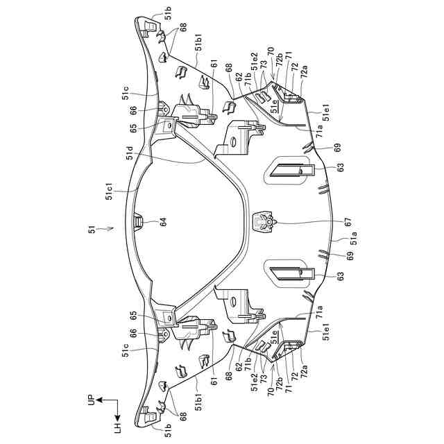 前記区画部(51e)の裏面には、前記ガイド(70)の前記ウィンカ(37)側に、第2リブ(73)が設けられる