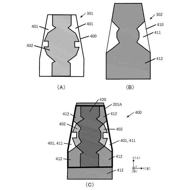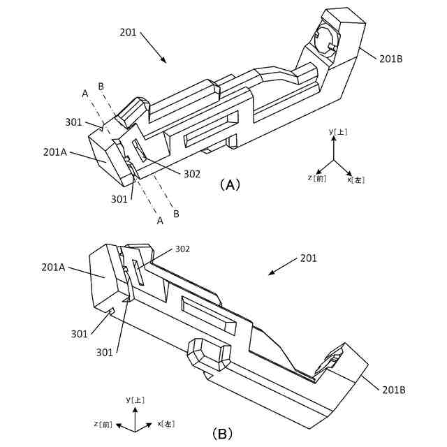まず図1を参照して、本実施形態に係る模型玩具100の外観構成の一例について説明する。図1(A)は模型玩具100の外観正面を示し、図1(B)は模型玩具100の外観側面を示す。なお、x,y,zの矢印はそれぞれ模型玩具における上、左、前方向の向きを示し、他の図面についても同様である。