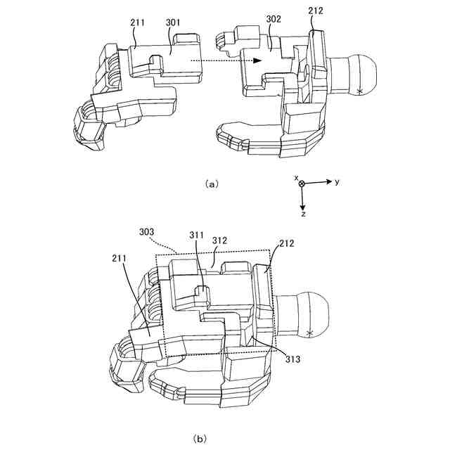 一実施形態に係る模型玩具の手部品の(a)側面図及び(b)分解斜視図。
